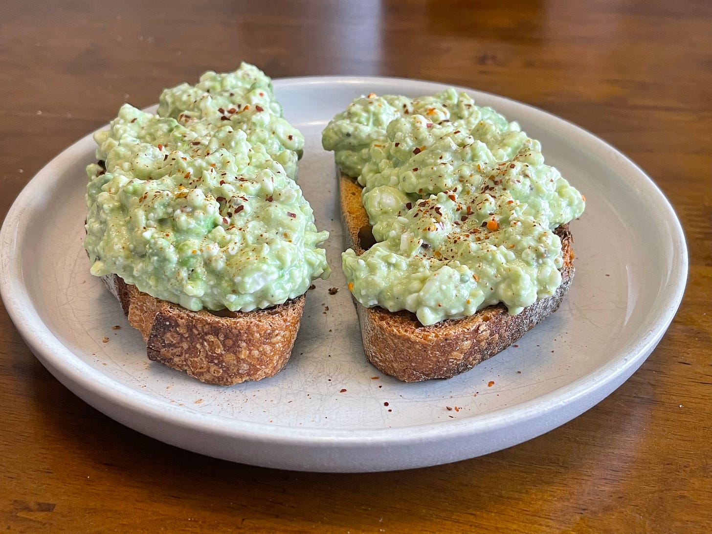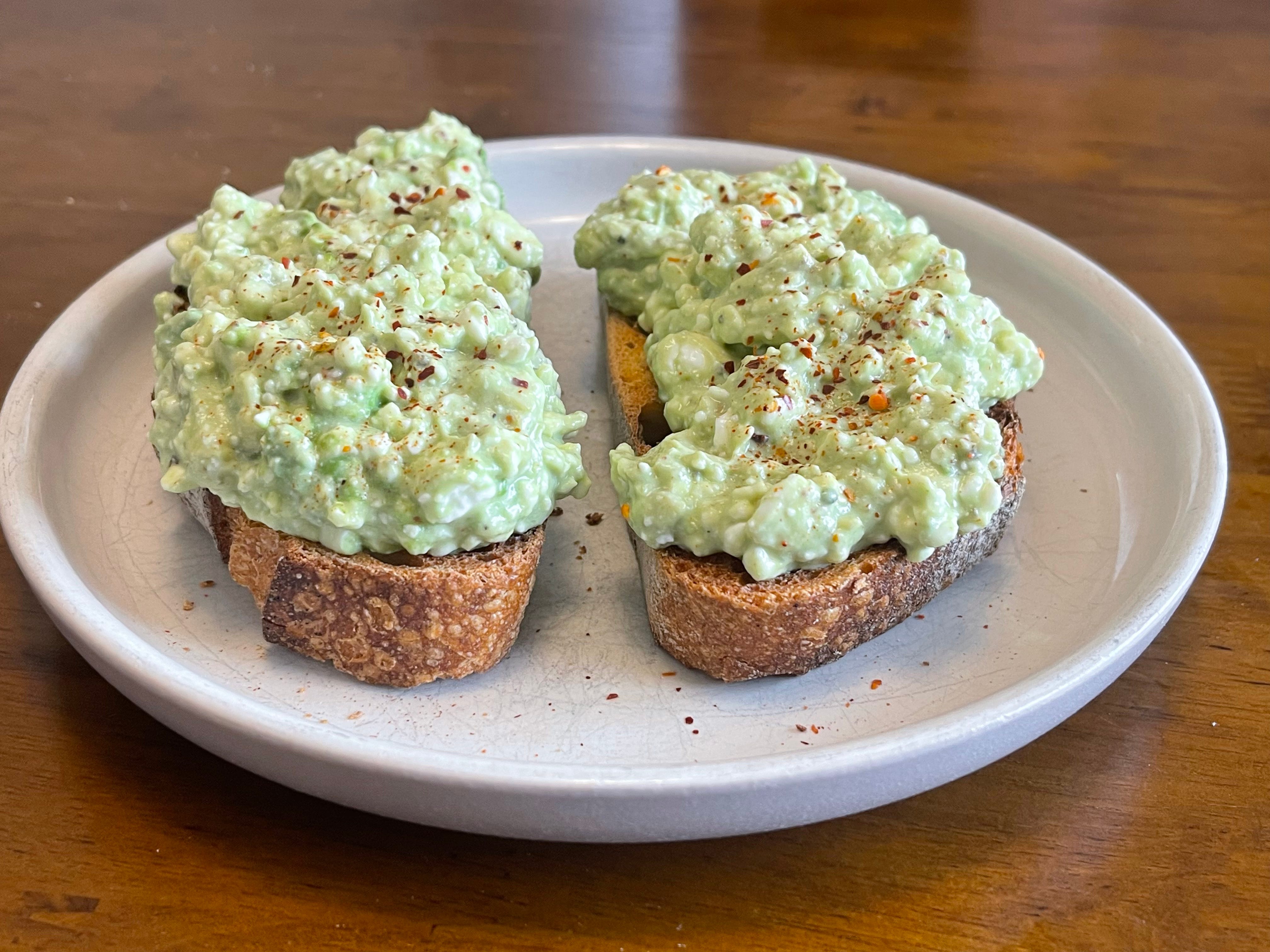 Mixing two heaping spoonfuls of cottage cheese with half an avocado and smearing it on toast.