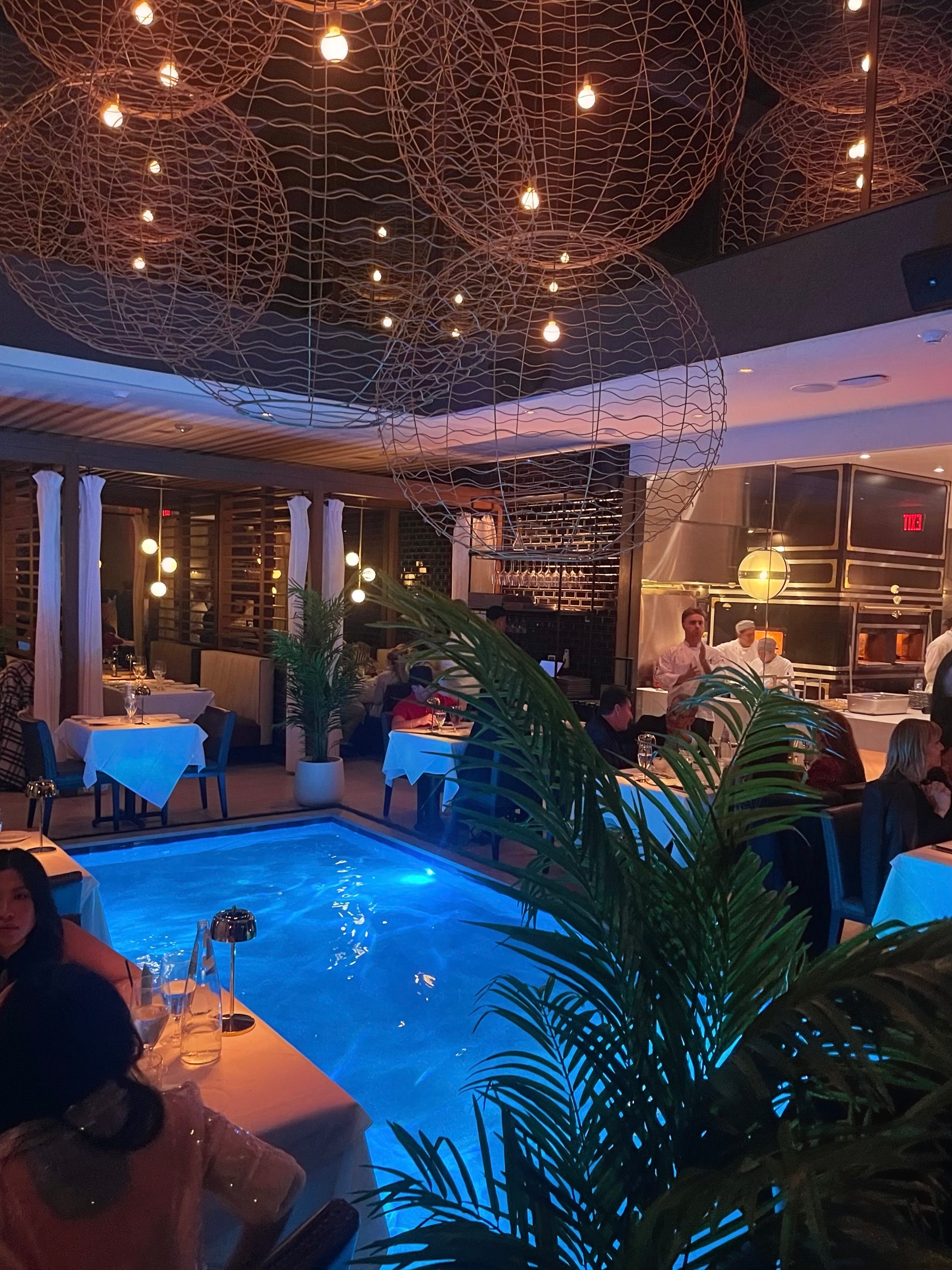 The “chicken-fried lobster tails” were something to write home about. My martini with blue cheese-stuffed olives was, surprisingly, not, but it got the job done. (The job of any martini is to make you feel decadent, of mind and of body.) I requested our party be seated in the restaurant’s indoor wing with a small pool. The glowing blue hue mimicked an overwater bungalow in the Maldives.