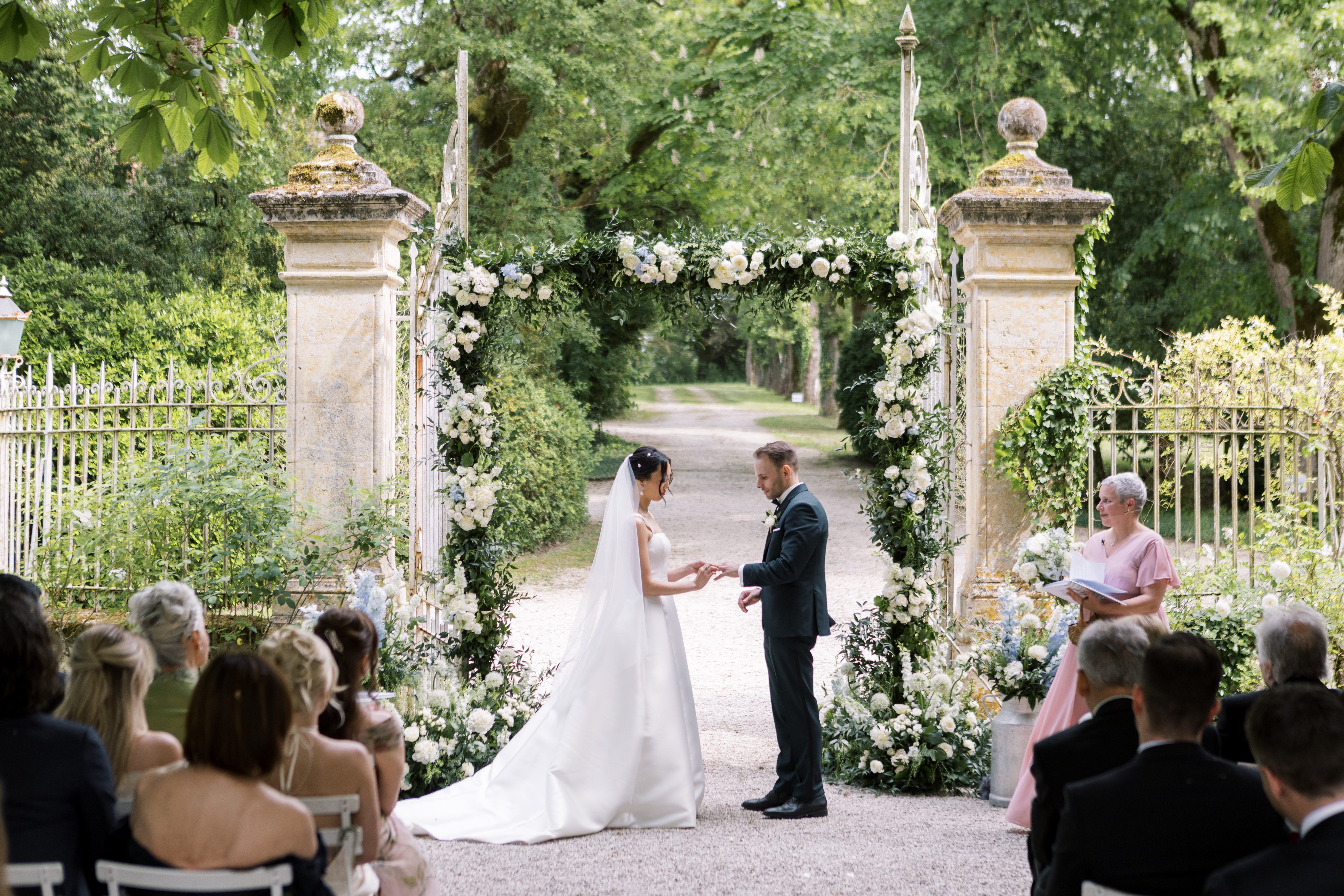 Céline Larigaldie. We paid a premium to find, seemingly, the only German, French, and English-speaking officiant in the area for our multilingual ceremony. She began by accidentally pronouncing my hometown, Newport Beach, as “Newport Bitch.” Everyone laughed. She did a great job.