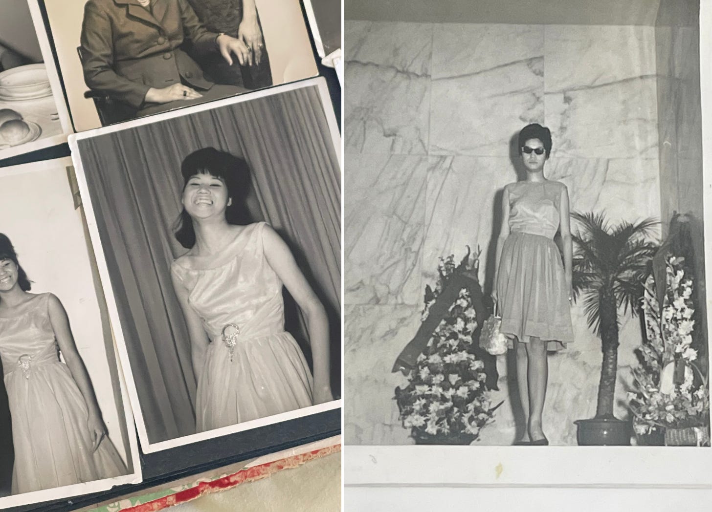 G-MA: A dress. Sometimes a skirt with a top. Hair, I don’t do myself. I go to a beauty salon. For shoes, one-inch high heels or sandals with a lot of bling-bling. Lipstick, maybe some eyeliner. Never foundation. I don’t put eyebrows because I don’t know how to draw eyebrows. I was very stylish for that time. Sometimes we’d (she and her sisters) go to a fabric store and have dresses special-made for us. At that time, there was no Chanel, Louis Vuitton, Hermès. Fashion was you go to a store and have clothes made for you.